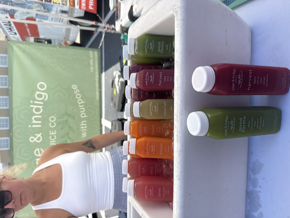 The image captures an outdoor vendor stall for "sage & indigo JUICE CO