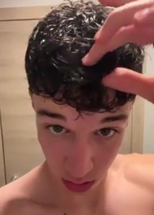 A young man with curly, dark, wet hair and light skin stands shirtless in front of a light-colored door with a silver handle. He touches his hair with his right hand and looks directly at the camera, appearing to speak. The lighting is bright.