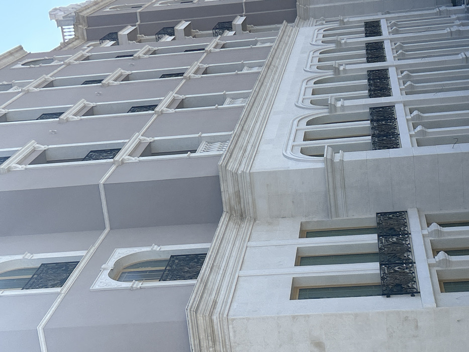 This image captures a section of a multi-story building facade in Shumen, Bulgaria, observed from a slightly upward angle. The architecture displays a neoclassical or baroque revival style, characterized by a light-colored, possibly stone or pre-cast concrete lower section, distinguished by vertical panels and a substantial horizontal cornice. Above this, the facade transitions to a light gray rendered or painted surface. The building features a repetitive pattern of windows and balcony elements. Several windows on the lower visible floors are tall and rectangular, fitted with light-colored frames and fronted by ornate, black wrought-iron juliet balconies with intricate scroll patterns. Higher sections include arched windows, some also with similar black wrought-iron railings, while other window recesses exhibit simpler white balustrades. Prominent horizontal cornices with decorative molding delineate the floor levels. Vertical pilasters and ornate detailing, including keystones and decorative scrolls, adorn the window surrounds. A decorative white balustrade, likely part of an upper story or roofline, is partially visible at the top right. The scene is illuminated by natural daylight, suggesting a clear daytime environment. No people, vehicles, or other surrounding environmental elements are visible beyond the architectural structure.