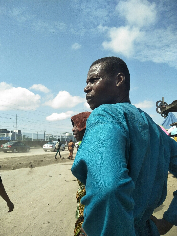 The image depicts an outdoor scene in Ajah, Nigeria, on a sunny day with a clear blue sky and scattered white cumulus clouds. In the foreground, positioned to the right of center, an adult male with dark skin and short, dark hair is shown in right profile, looking forward. He wears a long-sleeved teal garment. His face and forehead appear glistening, possibly from sweat. Directly behind him and slightly to his left, a second individual, also with dark skin, is partially visible. This person wears a brown head covering and a garment with a yellow and green patterned fabric. The middle ground, to the left of the primary subjects, consists of a dusty, unpaved stretch of ground. Further back, a paved road is visible with multiple vehicles, including a dark-colored sedan and a silver sedan, indicating traffic. Several pedestrians are discernible on or near the paved road, including one person in a light-colored outfit carrying a backpack. In the far background, industrial or modern buildings are visible, along with large utility poles and overhead power lines. To the right edge of the frame, behind the main subjects, a blue tarp structure, possibly a market stall or shelter, is partially visible, with a metallic-looking object featuring a series of connected circles extending upwards from it.
