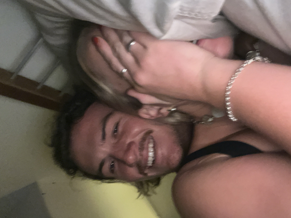 Two individuals are depicted in an indoor setting. On the left, a male with dark, curly hair, a mustache, and stubble beard smiles broadly towards the viewer, displaying his teeth. He is wearing a dark, possibly black, sleeveless top. His upper torso and head are visible. To his right, a female with blonde hair has her face largely obscured by her right hand, which covers her eye and cheek area. Her visible fingers are adorned with red nail polish, and she wears three silver-colored rings on her right index, middle, and ring fingers. Her left ear displays a silver-colored hoop earring with multiple small, light-colored charms, and a silver-colored link bracelet is visible on her left wrist. She is partially enveloped by white or light-colored bedding. In the background, above the individuals, a light-colored surface with a horizontal wooden beam or frame structure is visible. The scene is illuminated, suggesting an artificial light source. The location is an indoor space within Coalcliff, Australia.