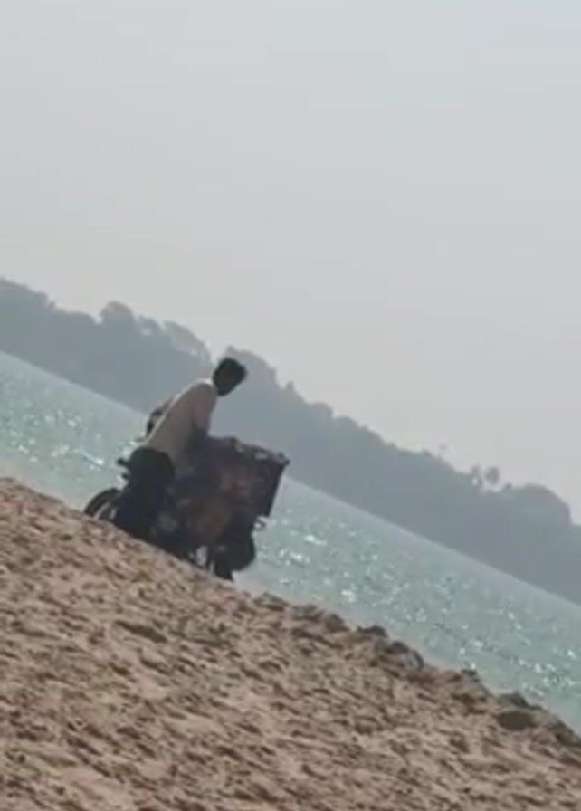 A medium, low-angle shot shows a man with dark hair on a sandy beach next to the ocean. He is wearing a light-colored shirt and dark pants, and is positioned next to a motorcycle that is carrying a large container. The motorcycle is on the sand, facing the water. The man appears to be tending to the load on the motorcycle. The water is a sparkling turquoise color. In the background, across the water, there is land covered in trees. The sky is a hazy white.