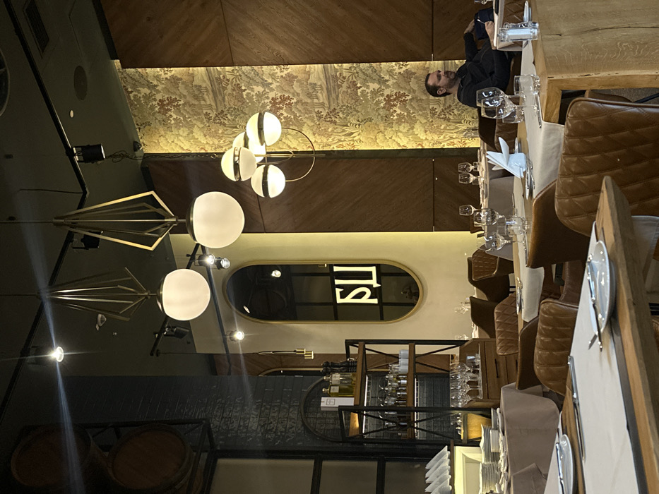 The image depicts the interior of an upscale restaurant in Beograd, Serbia, illuminated by artificial light. In the right background, one adult male, Caucasian, with a dark beard and dark hair, is seated alone at a table. He wears a dark long-sleeved top and holds a pen or stylus in his right hand, looking slightly left with a subtle smile. The midground and foreground are filled with numerous dining tables set with light-colored tablecloths, beige runners, white plates, cutlery, and multiple wine glasses. The chairs are upholstered in brown, quilted leather. A wooden table is visible in the immediate foreground. The ceiling is dark, from which hang several decorative light fixtures: two large, geometric brass chandeliers each with a single white spherical globe, and a multi-armed chandelier with four white spherical globes encased in brass rings. Additional recessed spotlights are also present. The left side of the background features a dark brick wall section with two large, round wooden barrel-like elements mounted vertically. Below these, a dark metal shelving unit with wooden shelves holds various bottles (e.g., olive oil), glasses, and stacked white dishes. In the center-background, a tall, narrow, oval-shaped mirror with a gold frame is mounted on a light-colored wall. The mirror reflects stylized, blocky characters that appear as "SLJI". To the right of the mirror, a vertical section of wallpaper displays a muted green and brown botanical pattern of trees and foliage, flanked by dark wooden wall panels.