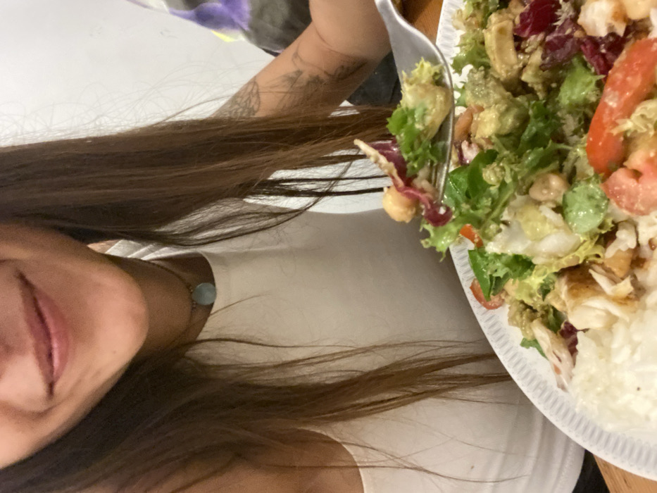 A close-up image depicts the lower portion of an individual's face, their upper torso, and a plate of food. The person, with long brown hair, wears a white sleeveless top and a light blue circular pendant on a dark choker. A faint tattoo, possibly depicting a feather or wing, is visible on their right inner forearm. A silver fork, held by the person, is lifted with a serving of mixed green and red lettuce, chickpeas, and a creamy green dressing. The white plate contains a meal composed of white rice, additional mixed salad with diced tomatoes, and chunks of what appears to be cooked fish or chicken. The background is blurred and light-colored, with an indistinct purple and dark gray object partially visible on the far right. No specific visual cues are present in the image to identify a precise location within Barcelona, Spain.