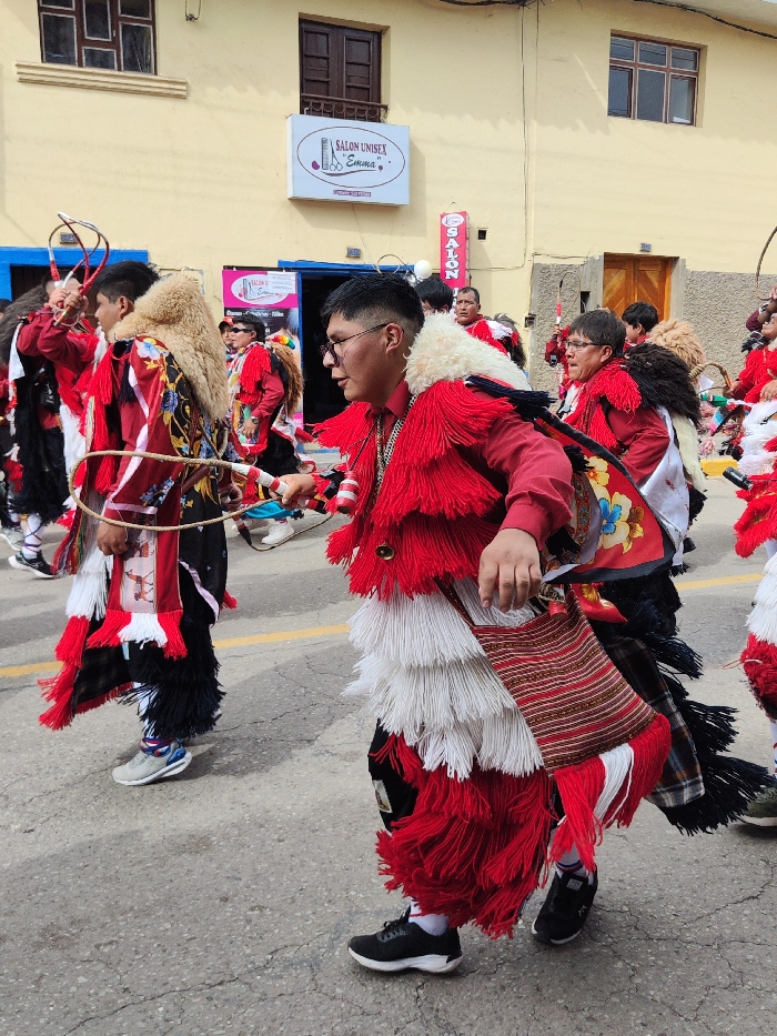 A group of people dressed in vibrant, traditional costumes parade down a street. The outfits are adorned with red and white fringe, possibly yarn. The central figure wears glasses and a bag. Others carry hoops. A building with signage reading "SALON UNISEX 'Emma'" is visible in the background, alongside other people watching the parade. The setting appears to be a town or village.