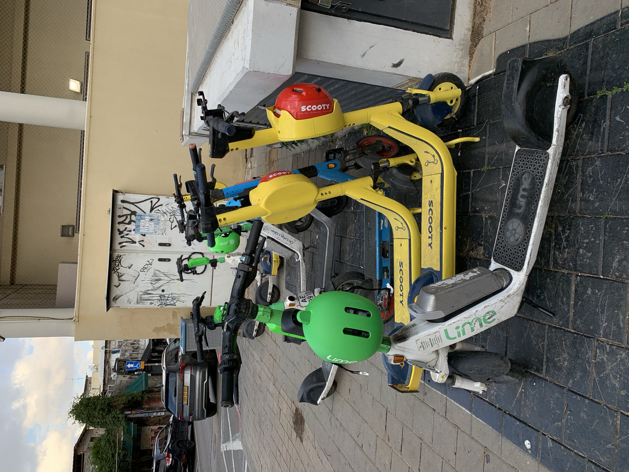 row of parked electric scooters on a paved sidewalk next to a building in an urban environment. The scooters are a mix of brands, including "Lime" and "SCOOTY," with some scooters sporting helmets attached. The "Lime" scooters are primarily white and green, while the "SCOOTY" scooters are yellow with either blue or red helmets. Graffiti covers a section of the building in the background. Cars are parked on the street adjacent to the sidewalk. Street signs are visible. The photograph seems to be taken in Tel-Aviv, Israel as indicated by a car's license plate.
