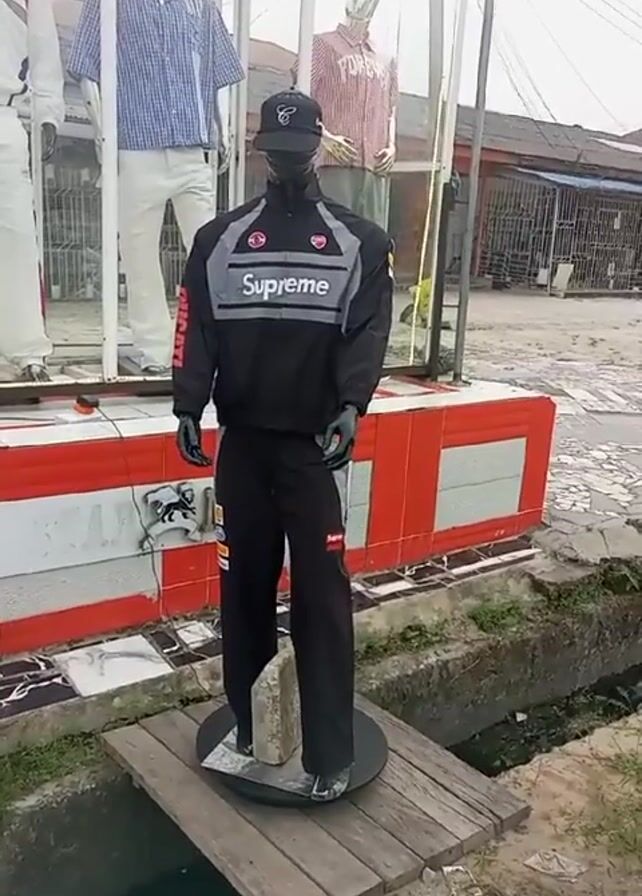 The scene shows a mannequin dressed in a black and gray Supreme tracksuit, black baseball cap, and black shoes, standing on a small wooden plank over a ditch. The mannequin is positioned in front of a display case containing other mannequins wearing various shirts and pants. The display case is decorated with red and white stripes. The background shows a street with buildings and what appears to be a market area. The setting appears to be outdoors, possibly near a clothing store.