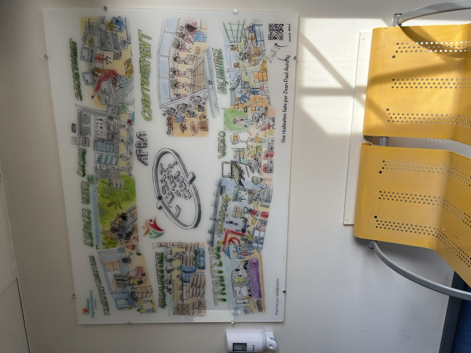 A large, rectangular, multi-panel illustrative diagram is mounted on a white wall, dominating the upper portion of the scene