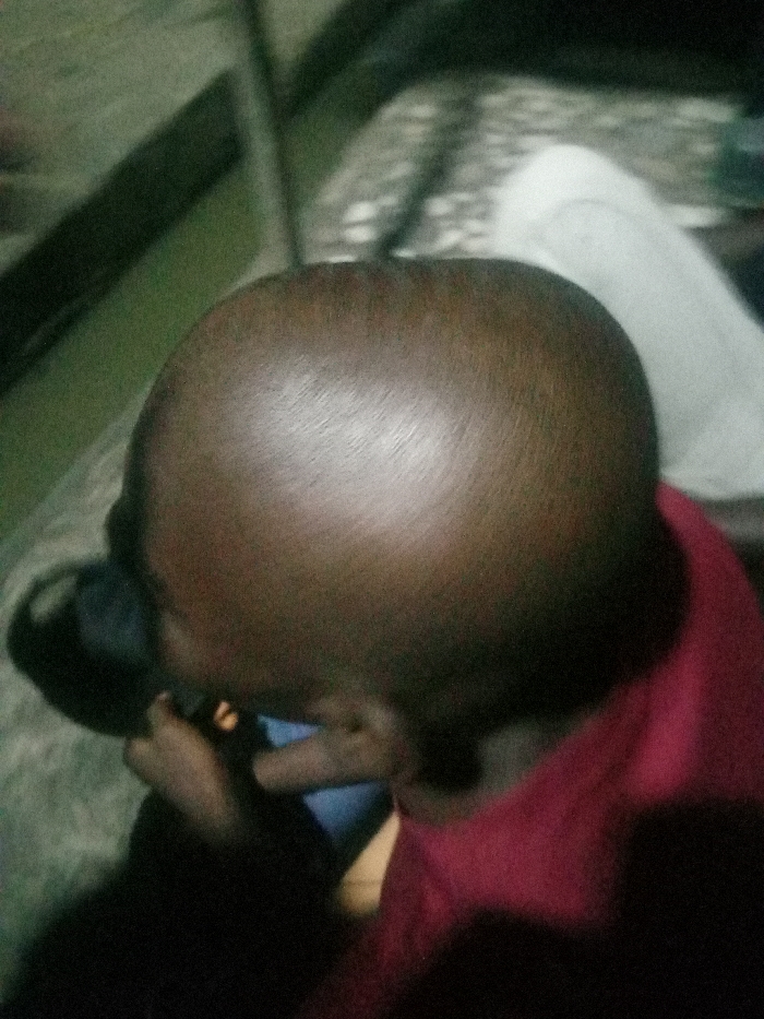 A close-up depicts the shiny, bald head of a dark-skinned child in a red shirt, partially turned away. The child's hands hold a phone or similar device, illuminated by its screen. Background elements suggest a casual setting, possibly a living room, with glimpses of a sofa and a white object, possibly clothing. The lighting is somewhat dim.