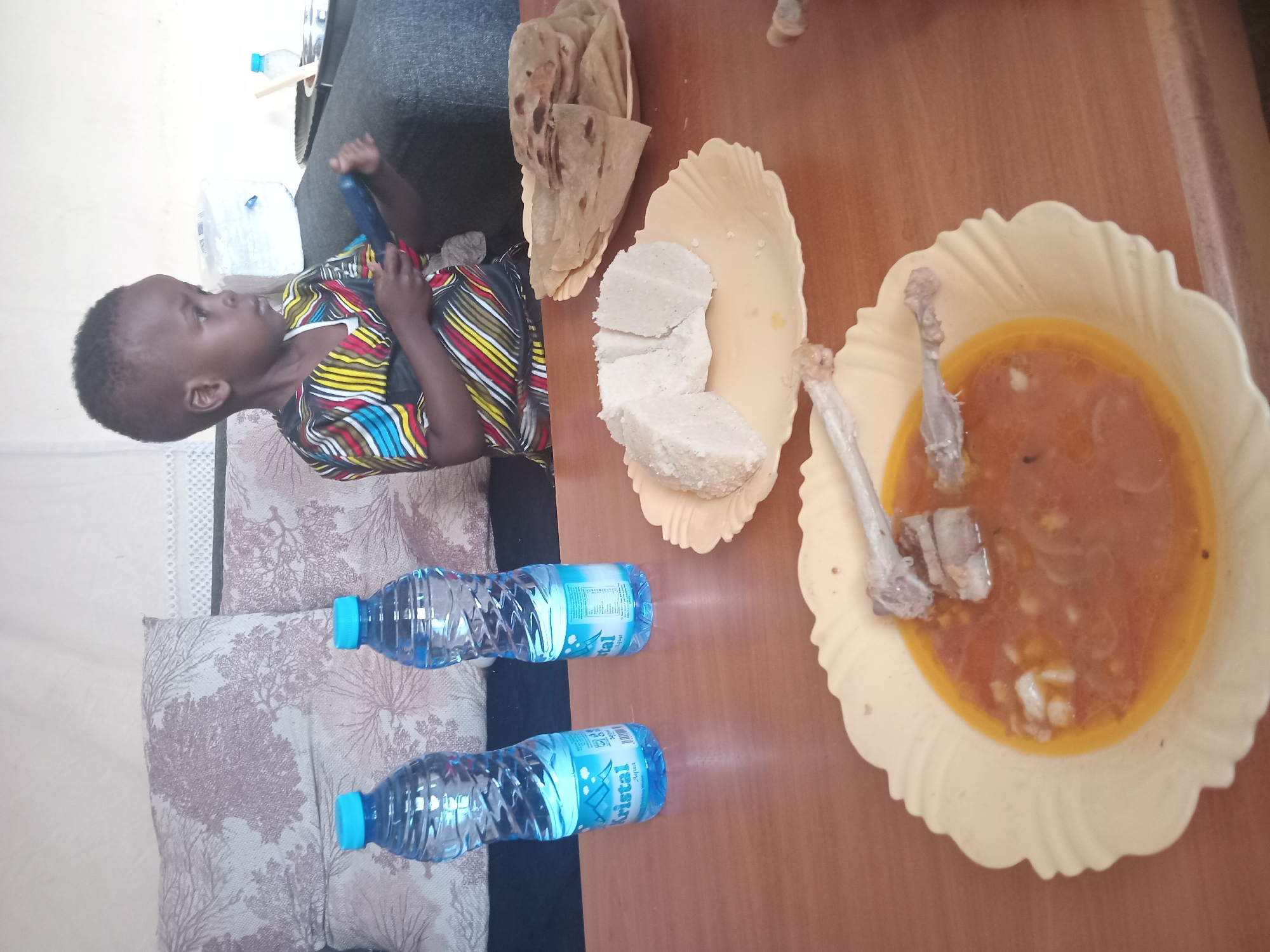 A child is seated on a floral print cushion next to a wooden table with several items. On the table are two bottles of "Kristal Aqua" water, a bowl of what appears to be ugali, a stack of chapati, and a bowl of soup with chicken bones in it. The scene appears to be indoors. This image does not contain information to confirm that it is in the city of Matulo Ward, Kenya.
