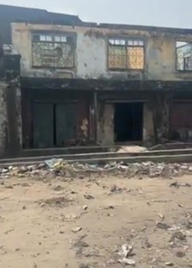 The video depicts a street in disrepair. A two-story building with barred windows and weathered, peeling paint dominates the foreground. The ground is uneven dirt and littered with trash. Power lines crisscross overhead, and a leaning utility pole adds to the sense of neglect. Further down the street, people are walking, and motorcycles are visible. The overall impression is one of poverty and urban decay.