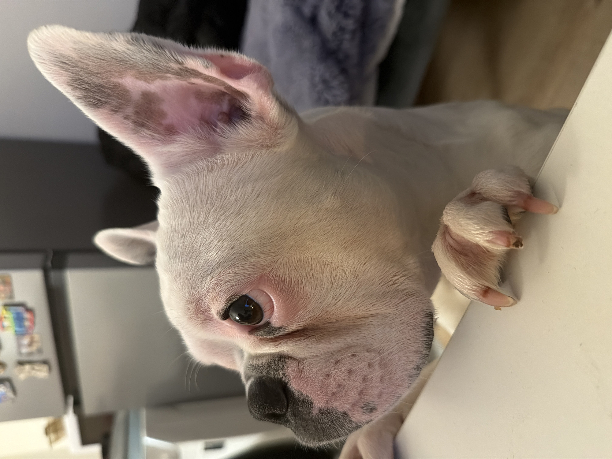 A close-up, slightly skewed shot focuses on a white French Bulldog. The dog's head and upper body are predominantly visible, with its left ear prominently displayed, revealing speckled markings within the ear. Its right paw rests on a white surface, possibly a table. The dog has dark eyes and a black nose with pinkish speckled patches around its muzzle. A refrigerator with magnets attached to its door can be seen in the background. There are no indications that this image was taken in Sofia, Bulgaria.