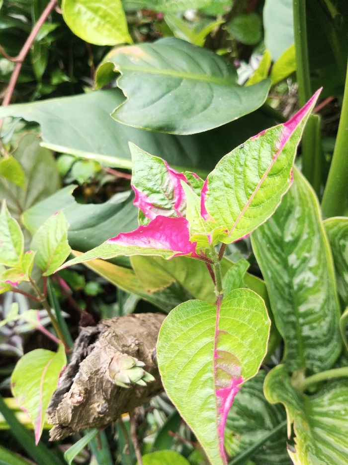 The scene depicts a close-up, natural botanical environment in Mindat, Myanmar. The primary subject is a plant featuring ovate, pointed leaves predominantly light green with prominent magenta-pink coloration along their margins and central veins. One leaf in the upper right quadrant presents a minute, dark, insect-like entity on its surface. In the midground, left of the central plant, lies a weathered, light brown/gray segment of wood or branch, exhibiting small green sprouts. The background consists of dense, varied green foliage. A larger, darker green leaf in the upper left quadrant shows a distinct irregular bite mark on its edge. Other background leaves display mottled patterns. No human subjects, man-made objects, or actions are visible. The scene is illuminated by natural daylight.