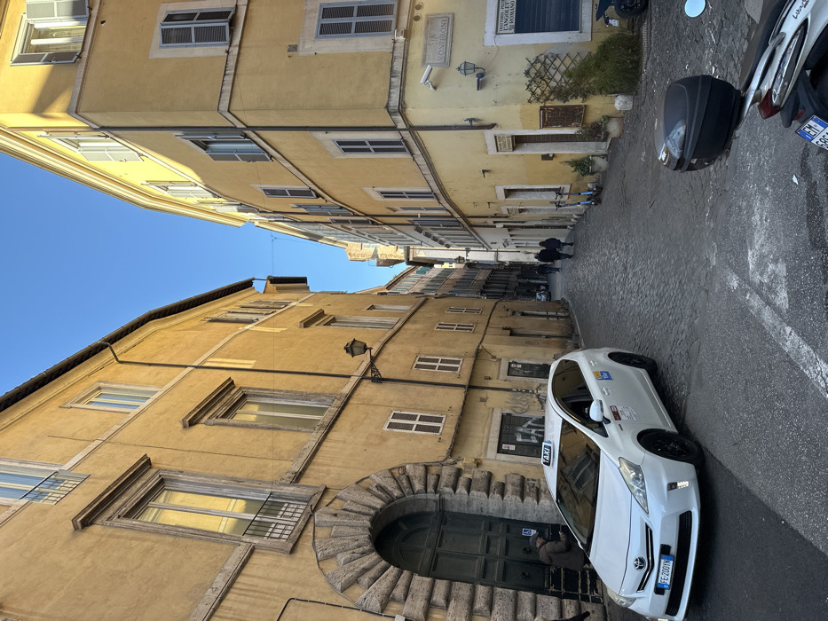 The image depicts a narrow, cobbled street in Rome, Italy, identified by a street sign on the right building corner as Via Montevecchio, at its intersection with Via Montebello. The scene is illuminated by daylight under a clear blue sky. Two multi-story buildings with weathered yellow-ochre facades line the street. The left building features a large arched entrance constructed with rustic stone voussoirs, framing a dark green wooden door. A blue and white accessibility sign (wheelchair symbol) is affixed to this door. A white Toyota Prius C taxi, clearly marked with a "TAXI" roof sign and displaying the Italian license plate "FE 200YA," is positioned in the foreground, facing away from the camera, partially on a paved section of the roadway. An individual wearing a brown jacket stands near the arched entrance on the left, looking down at an object in their hands. Further down the cobbled street, two figures are visible walking away from the viewer. The building on the right corner features a security camera mounted above a street sign, which also displays information for "HISTORIA PIZZA L'ANGOLO ROMANO." Two electric scooters are parked upright against the facade of this building. In the bottom right foreground, a dark-colored scooter with a black rear storage box is partially visible, displaying a partially obscured Italian license plate beginning with "HEM 686." Sunlight strikes the upper sections of the buildings, casting distinct shadows on their lower facades and the street below. Numerous windows with closed or partially open grey-blue shutters are visible on both buildings.