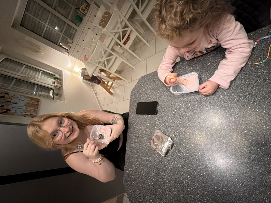 A woman and a child sit at a table. Both are eating pink snacks from plastic containers with spoons. A phone sits between them on the table. A used package sits next to the phone. The woman has blonde hair, glasses, and a black tank top. The child has curly hair and a pink shirt. A white hutch and chairs are in the background, and a painting hangs on the wall.