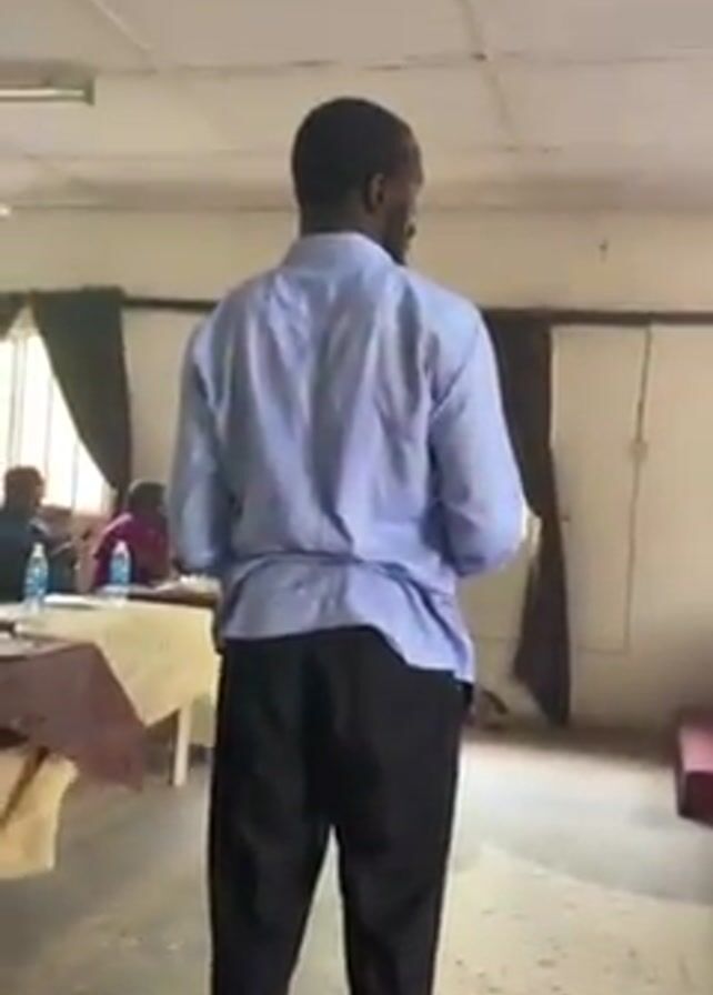 A man in a light blue shirt and black pants is standing in a room and talking to a group of people seated at a table