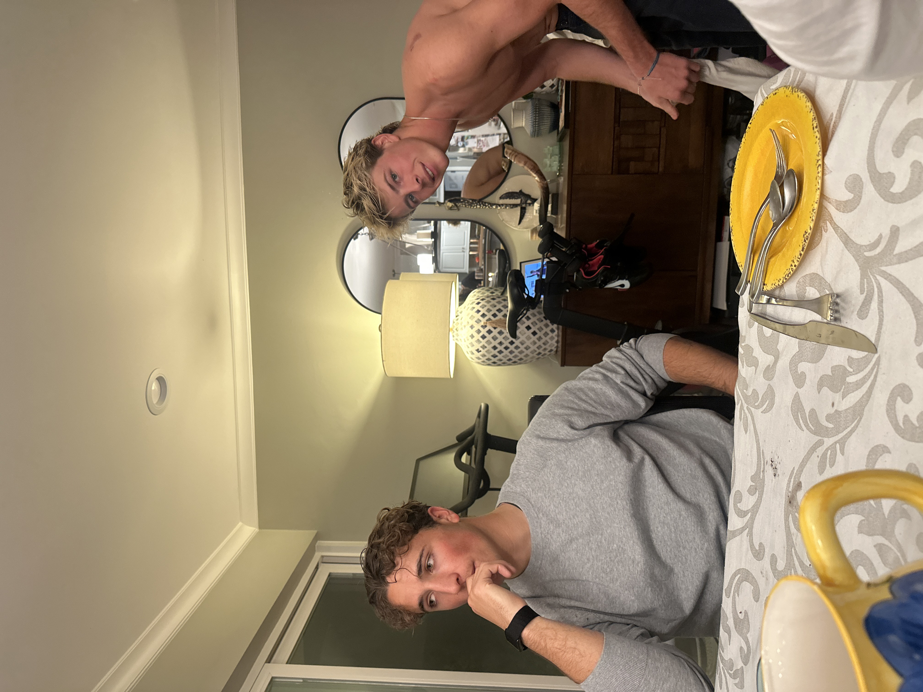 Two young men are inside. One is shirtless, standing near a table with a yellow plate, silverware, and a patterned tablecloth. He is reflected in a mirror showing a dining room setup. A lamp illuminates a nearby exercise bike. The second man, wearing a gray sweatshirt and a watch, is seated at the table looking pensively at the camera. He is near a window.