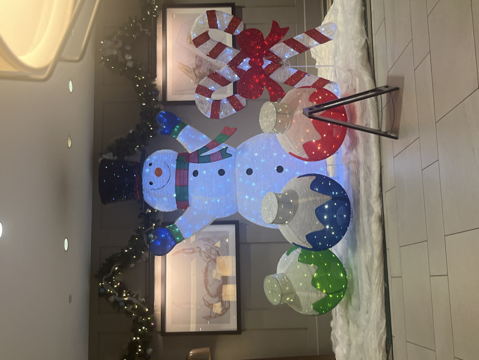 This image displays a Christmas holiday decoration arrangement in an interior public space, likely a lobby or common area, within San Francisco, United States. The central feature is a large, illuminated white snowman with a black top hat, a multicolored striped scarf (green, red, blue), black buttons, an orange carrot nose, and blue-gloved hands raised. The snowman is internally lit with white lights. To its left, three oversized, internally illuminated Christmas ornaments are positioned on a simulated snow base: one green and white, one blue and white, and one red and white, each topped with a silver cap. To the snowman's right, two large, illuminated white and red striped candy canes are intertwined and adorned with a red glitter bow. The entire display rests on a white, fluffy material resembling snow, covering a low platform. The background features a light brown wall with two framed artworks. The left artwork depicts a large crab and abstract shapes, while the right displays an architectural or abstract drawing. A green festive garland, decorated with small lights and ornaments, is draped across the upper portion of the wall, extending over the artworks. Overhead, recessed lighting is visible, along with a large, curvilinear ceiling light fixture partially seen in the upper right. The floor consists of light-colored, rectangular tiles. A small, black A-frame sign with a connecting chain stands on the tiled floor in front of the red ornament. No people are present in the scene.