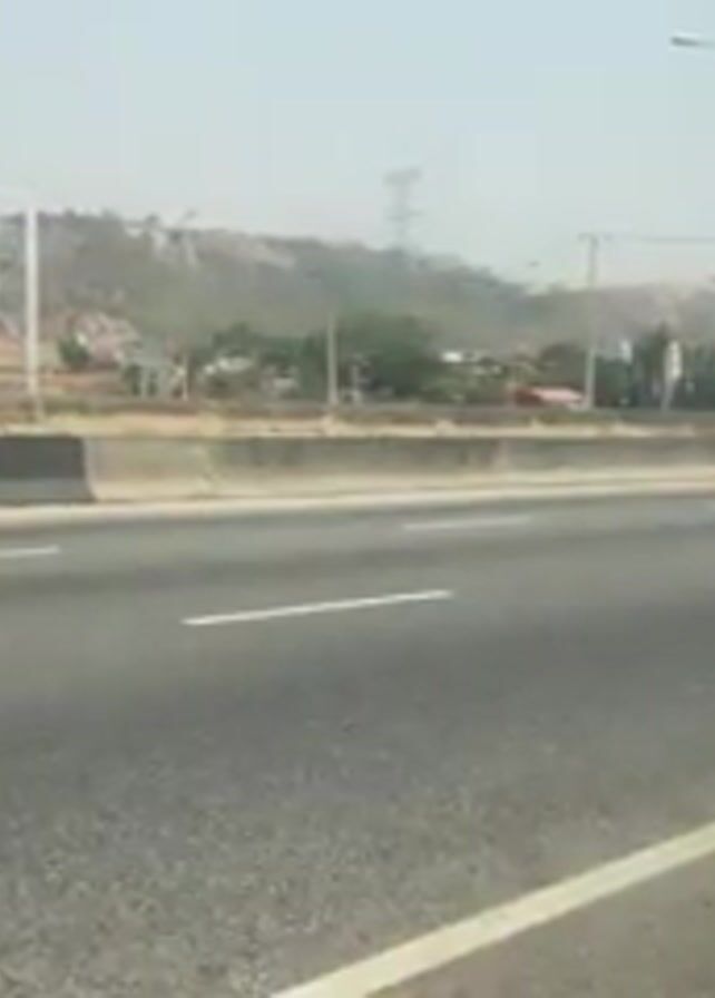 view from a moving vehicle on a highway. There are several lanes visible, separated by white lines. A concrete barrier divides the highway from a parallel road with additional vehicles. In the distance, a large billboard structure, possibly for advertising, is visible against a backdrop of hills. Streetlights line the highway, and another car passes in the opposite direction. The sky is overcast.