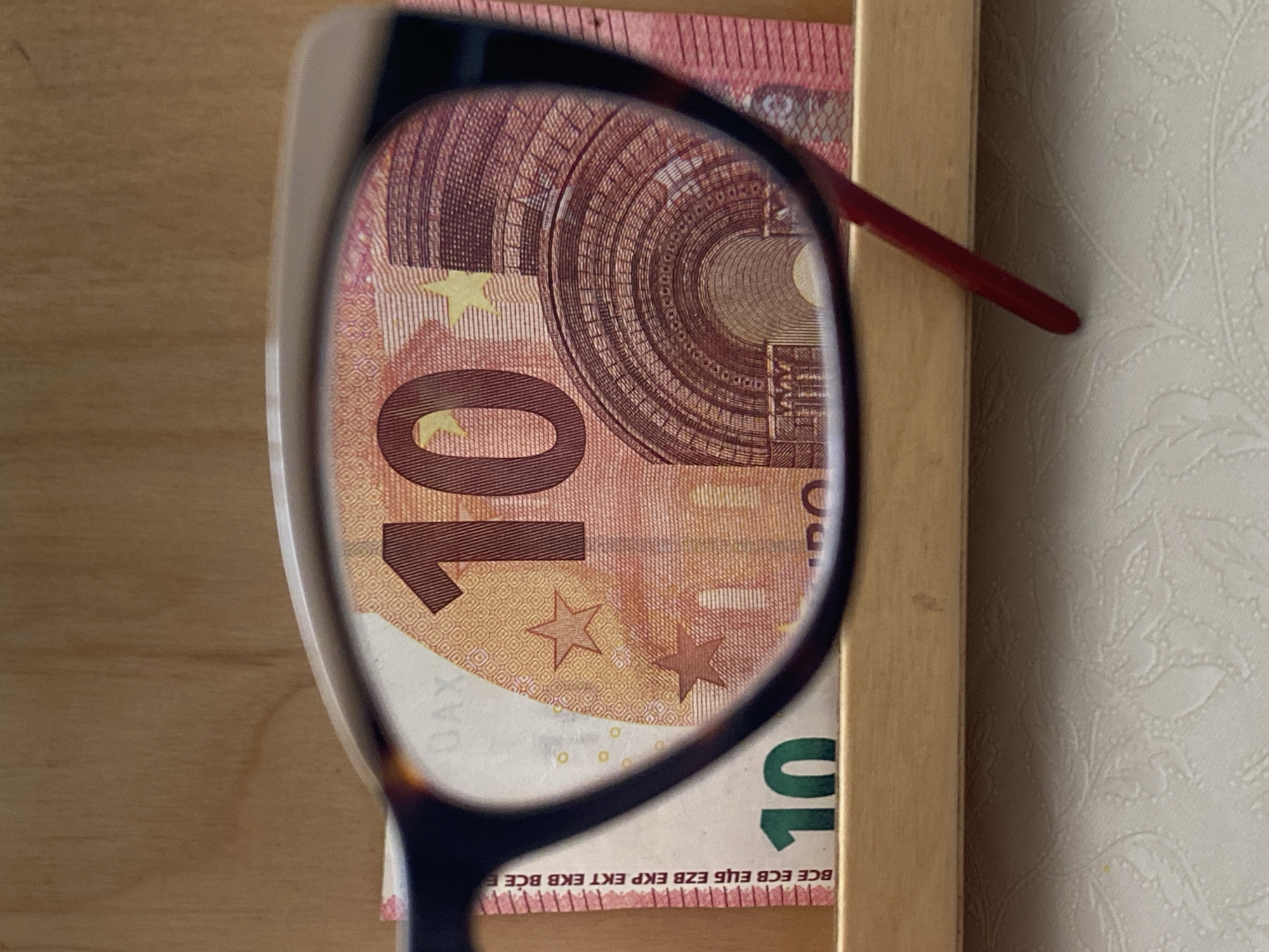 A close-up captures a 10 Euro banknote viewed through a pair of glasses