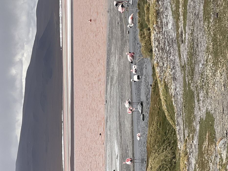 The scene shows a large, pink lake fringed by a light-colored shoreline and backed by a dark mountain under a cloudy sky. Several flamingos are visible in the lake along the right side of the image. They stand close to the edge of a grassy, rocky area. The pink hue of the water is notable against the landscape.