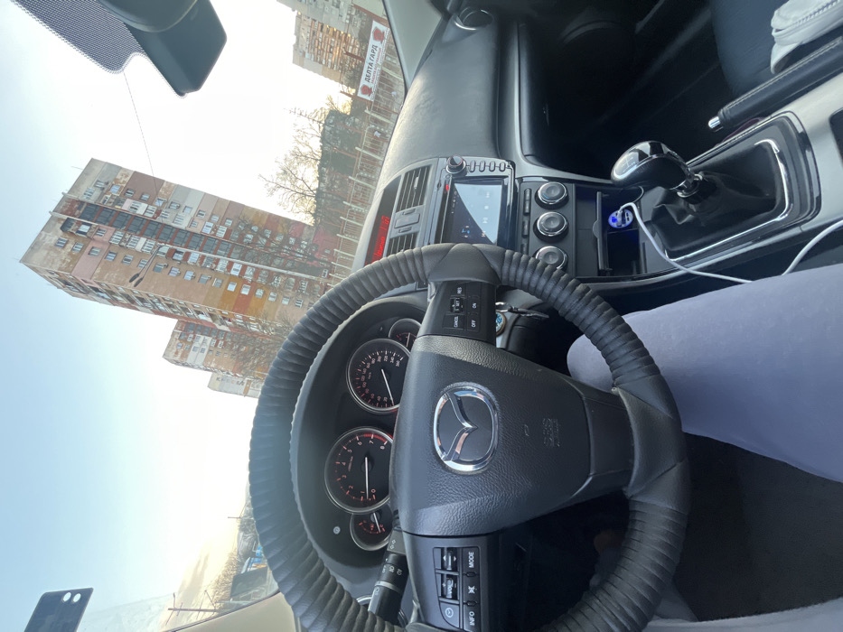 The image depicts the interior of a vehicle from the driver's perspective, looking through the windshield towards an urban environment. In the foreground, the black steering wheel of a Mazda car is visible, fitted with a black, ribbed aftermarket cover. The instrument cluster shows a tachometer and speedometer with red needles, both indicating zero. The driver's lower legs, clad in light blue or grey pants, are visible beneath the steering wheel. The center console features an aftermarket infotainment system with a touchscreen displaying a music interface, positioned above three rotary knobs. A manual transmission gear shift lever is located to the right of the driver, next to a handbrake. A blue illuminated USB car charger is plugged into a power outlet below the infotainment system, with a white cable extending from it. A small, grey item, possibly a wallet or bag, rests near the handbrake. Through the windshield, several tall, multi-story residential buildings are visible under a clear, light blue sky. The most prominent building, centrally located, exhibits a weathered facade with faded patches of orange, pink, and white. Bare trees without foliage are situated between the car and the buildings. A metal fence runs along the roadside. On the right, a white banner with red text displays "ДЕЛЬТА ГАРД" (DELTA GARD), indicating the presence of a security service or similar entity. The architecture and text suggest a location in a city within a Cyrillic-speaking region, but the specific city and country are Unknown, Unknown.
