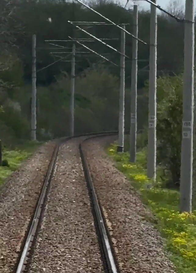 train traveling on a railway track. The track is surrounded by green vegetation and trees. Overhead power lines are visible. The sky is blue with white clouds. The camera is positioned inside the train, looking forward.