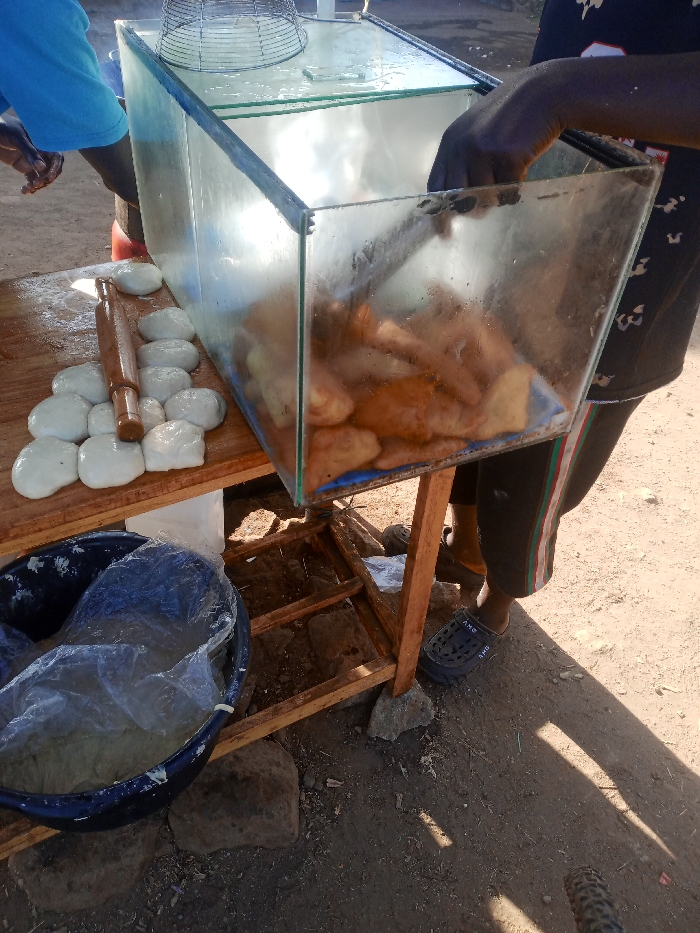 A roadside vendor prepares fried dough. Round dough balls and a rolling pin sit beside a glass display case filled with cooked pastries. A person reaches into the case, presumably to serve a customer. A large bowl of dough is under the makeshift wooden stand. A metal fryer screen sits on top of the display case. The vendor stands on a dirt path next to their stand.