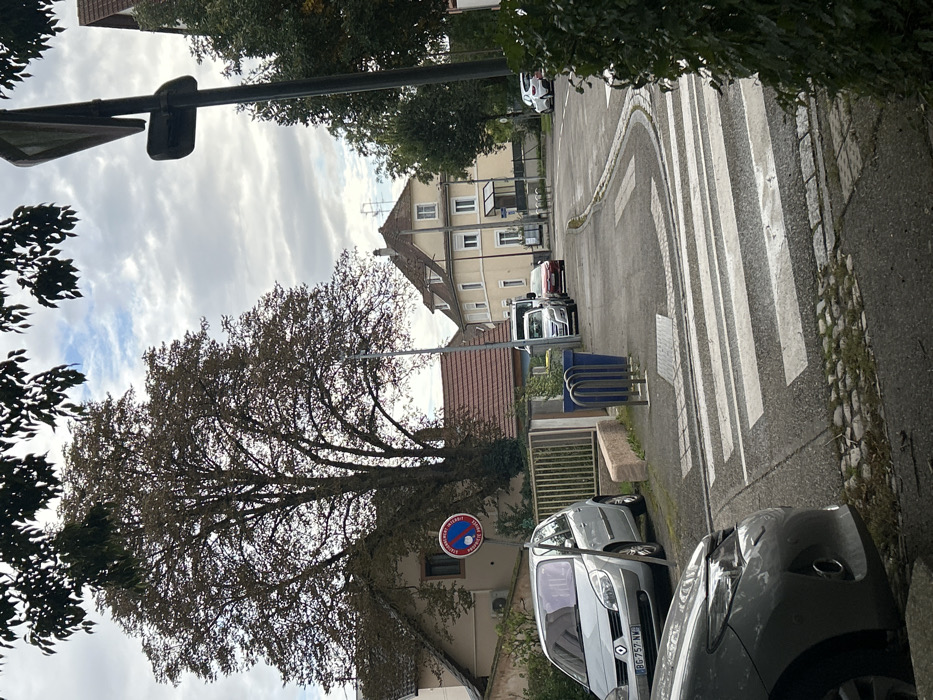 The image displays a residential street in Strasbourg, France, captured under an overcast sky