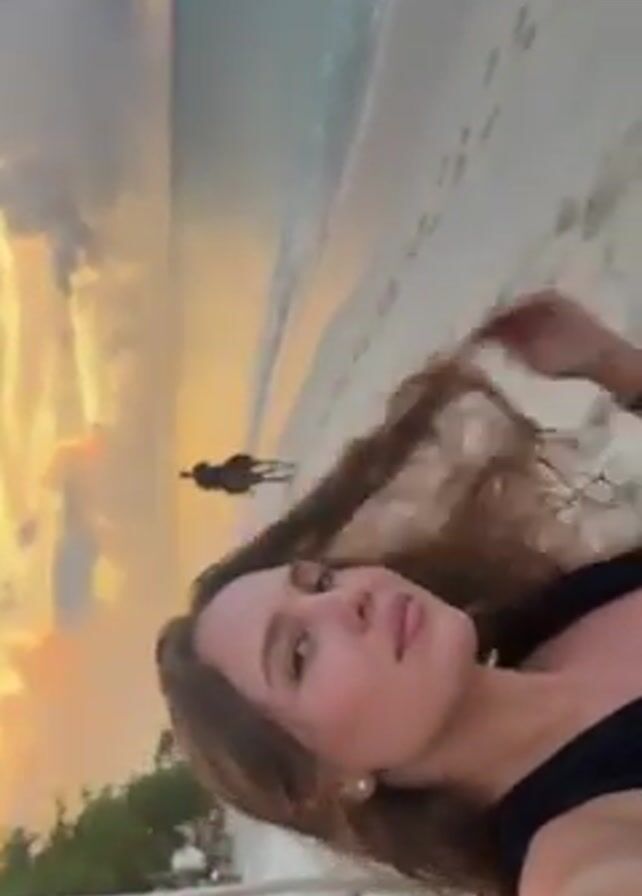 A young woman in a black swimsuit takes a selfie on a beach at sunset. The beach is sandy and there are footprints and hoofprints in the sand. In the background, two people are riding horses on the beach near the water's edge. The sky is a mix of orange, yellow, and gray. The woman makes a kissing face for the camera.