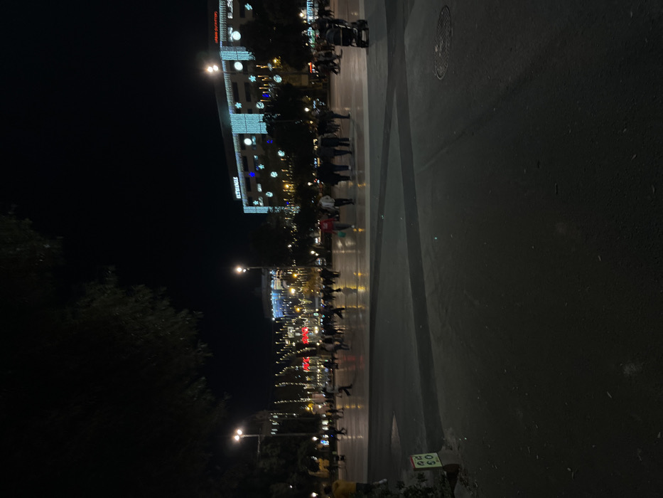 A night scene captures an expansive urban square illuminated by rows of streetlights. Silhouetted figures populate the walkway, suggesting a bustling public space. In the distance, a brightly lit building, possibly commercial, stands tall, adorned with festive lights. The foreground features a dark, wet paved surface. A manhole cover is on the right side of the frame. The image is slightly tilted, contributing to a dynamic perspective.