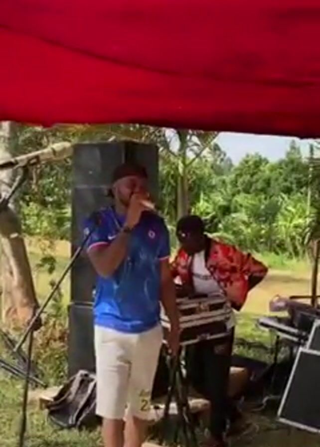 A group of musicians are performing on a makeshift stage outdoors under a red canopy. The singer wears a blue jersey, light shorts and sunglasses, and holds a microphone in his hand. Behind him, another musician plays on an electronic keyboard. A second camera view reveals a drummer and another musician playing a vibraphone. The environment is lush with green trees and palm fronds. The sky is overcast and bright.