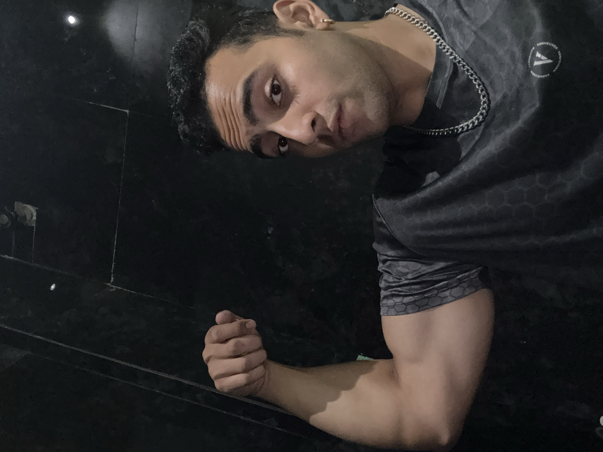A man with dark hair and fair skin is posing in a dimly lit room with dark walls. He is wearing a dark gray t-shirt with a subtle hexagonal pattern and a silver chain necklace. He is flexing his right arm, and his hand is clenched in a fist. His expression is serious, and he is looking directly at the camera. The background is dark and appears to be a textured wall or surface. The location is unknown and cannot be ascertained from the image.
