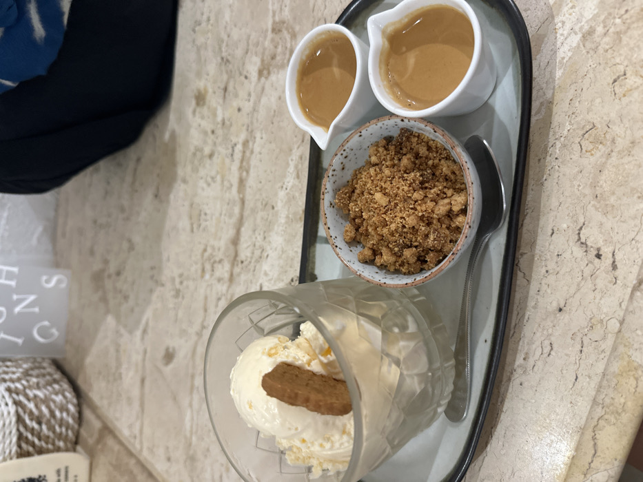 The image displays a dessert and coffee service presented on a light-colored, veined marble table in Baan Bo Phut, Thailand. A rectangular, dark-rimmed grey tray holds three distinct components. On the left, a clear glass tumbler, featuring an etched pattern, contains scoops of pale yellow ice cream with small orange inclusions. A single, upright, rectangular, ridged biscuit is embedded in the ice cream. Adjacent to the ice cream, a small, speckled ceramic bowl with a brown rim holds a quantity of light brown, coarse crumbly material. A silver spoon rests on the tray, extending from beneath this bowl. To the right of the crumble, two small white ceramic pitchers, each with a handle, contain a light brown liquid. In the upper right background, the lower torso of a person wearing dark trousers and a blue patterned garment is visible. The upper left background reveals a woven basket. Faint white letters are present in the central background, including 'I,' 'G,' 'H,' 'N,' and 'S'.