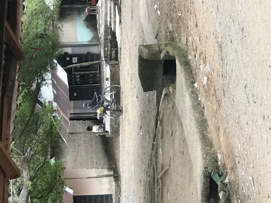 An outdoor scene features a narrow dirt path flanked by buildings and foliage. The structures are a mix of brick, metal, and wood. A bicycle leans against one building, near a person sitting on a ledge. A deep, concrete drainage channel runs along the path, partially covered by a stone structure. Debris and trash are scattered along the path. The image appears to be taken in a rural or impoverished area.