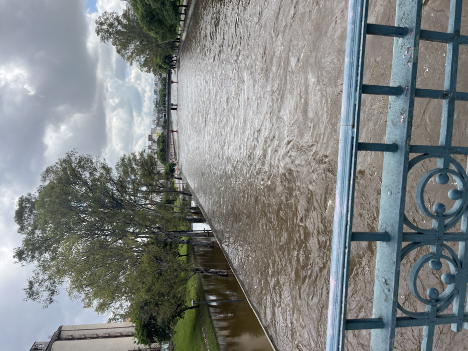 The image provides an elevated perspective of a section of the Suquía River in Cordoba, Argentina, under an overcast sky. In the immediate foreground, a teal-colored metal bridge railing with decorative scrollwork is visible, marked by faint pinkish graffiti on its top rail. The river, occupying the majority of the midground, flows turbulently with a high, murky brown water level. On the left riverbank, a paved promenade and the lower sections of multiple mature trees are partially submerged by the elevated water. Several lampposts along this bank also have their bases covered by water. To the far left, a tall, light-colored urban building with a prominent cylindrical or silo-like extension rises behind the trees. Further downstream, a multi-span concrete road bridge with reddish railings crosses the river. The right riverbank, parallel to the left, is also lined with trees, their lower trunks immersed in the river's high waters. The background reveals a dense urban skyline under a heavily clouded sky. No individuals are visible, and no specific actions or interactions are depicted beyond the natural flow of the high-water river.