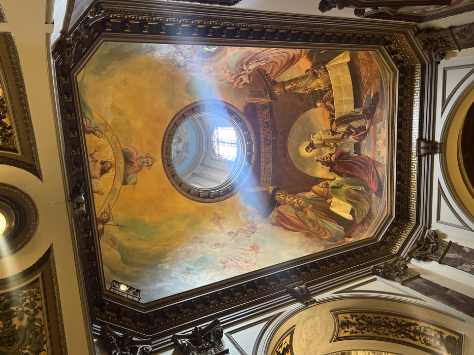 The image showcases an ornately decorated ceiling in a church or similar building. The ceiling features a large painted mural depicting religious figures, angels, and symbolic imagery. A circular opening in the ceiling allows natural light to stream in, creating a focal point. The surrounding architecture is richly adorned with gold accents, decorative moldings, and classical elements, emphasizing the grandeur and sacred nature of the space.