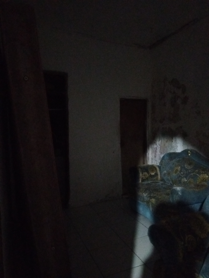 The image captures the interior of a dimly lit room in Budbud, Philippines. The scene is illuminated primarily by a directed light beam, originating from an unseen source in the immediate foreground, casting a prominent shadow onto the floor and a dark blue sofa. This sofa, located on the right side of the frame, features faded floral upholstery with lighter accents and appears worn. The wall behind the sofa exhibits widespread peeling paint and discoloration. Two dark, rectangular doorways are visible in the background: one centrally placed and another further to the right. To the far left, a dark brown vertical fabric element, possibly a curtain, is present, displaying at least one circular grommet. The floor consists of dark-colored tiles with visible grout lines in the illuminated area. No individuals are depicted within the frame; however, the localized light source and its shadow indicate the presence of a person holding the illuminating device.