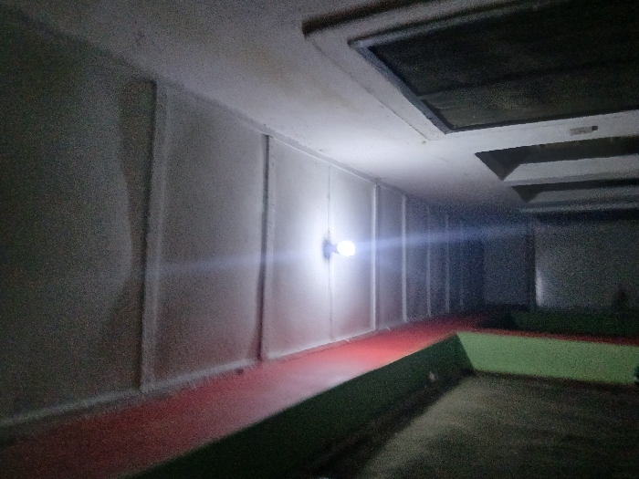 A long, dimly lit room features textured wall panels, with a single light fixture emitting a bright glare midway down