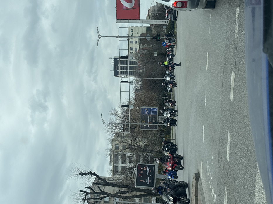 The scene depicts a wide, multi-lane urban intersection in Plovdiv, Bulgaria, specifically the crossing of General Gurko Street and Patriarch Evtimiy Boulevard, under a uniformly overcast sky. A procession of approximately 15-20 motorcyclists, each wearing a helmet and riding gear, is actively moving through the intersection. The motorcycles are primarily dark-colored, with a prominent red sport bike in the mid-ground. A uniformed traffic police officer, distinguished by a bright yellow reflective vest over a dark uniform, stands centered in the intersection, directing traffic with an outstretched right arm, appearing to facilitate the motorcycle passage. White lane markings are clearly visible on the asphalt roadway. To the left, multiple multi-story buildings and bare deciduous trees line the street, featuring a large billboard advertising a musical event. In the background, a tall, dark-topped building, identifiable as the Hotel Trimontium Princess, rises above surrounding structures. Traffic lights are suspended above the intersection, and modern street lamps with decorative tops are visible. A partially visible silver vehicle is in the immediate right foreground, indicating the perspective from within a car. Pedestrians are observable on the far right sidewalk near a bicycle.