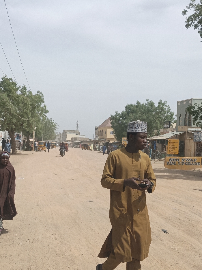 An overhead-level street scene in Hotoro North, Nigeria, depicts a dusty, unpaved road under an overcast sky