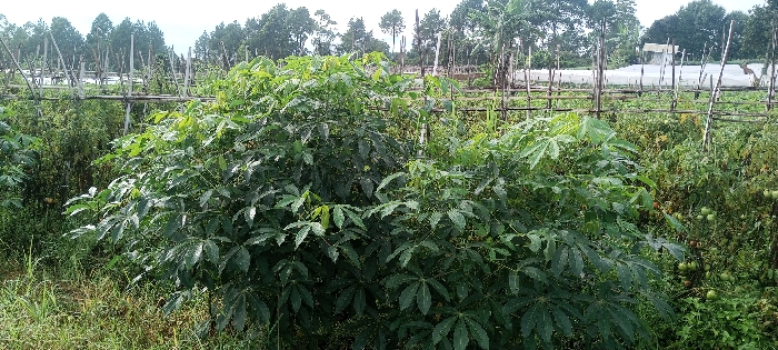 The image displays a lush, green field with dense vegetation. In the foreground, two prominent cassava plants dominate the scene, their characteristic palmate leaves creating a full, leafy presence. Behind them, a rustic wooden fence stretches across the midground, supporting various climbing plants. Beyond the fence, a cultivated field extends towards the background, interspersed with crops like tomatoes. A building is slightly visible in the back, with trees completing the horizon.