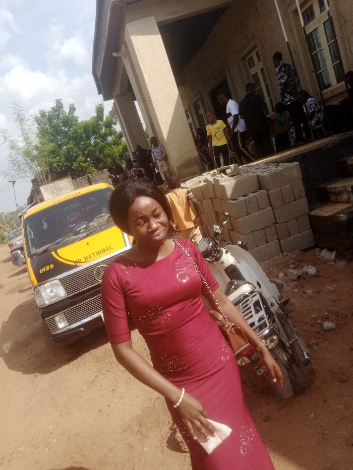 The image depicts an outdoor scene in Nsugbe, Nigeria, during daylight hours under a partially cloudy sky. In the foreground, a dark-complexioned woman with dark hair stands facing the camera, smiling slightly. She is wearing a fitted, maroon-colored, short-sleeved dress adorned with silver-colored embellishments, a pearl bracelet on her left wrist, and a brown shoulder bag. Her left hand holds a folded white tissue or paper. Behind her, to the viewer's left, a yellow and black commercial passenger van is parked on an unpaved, reddish-brown dirt road. The van features "NP NATIONAL" and "0129" markings, along with "SOLUTION" on its windshield area. Further left, green foliage and trees are visible. To the woman's right and extending into the background, a light-colored, multi-story building with prominent pillars and windows stands. Several individuals, including adults and children, are visible near the building's entrance and porch, some standing and some appearing to be seated. A child in a yellow shirt is visible near the building's entrance. Adjacent to the building and behind the woman, a stack of grey concrete blocks is present on the unpaved ground. Partially obscured behind the woman and next to the concrete blocks is a light-colored motorcycle or moped. The entire ground surface is unpaved, consisting of reddish-brown dirt.