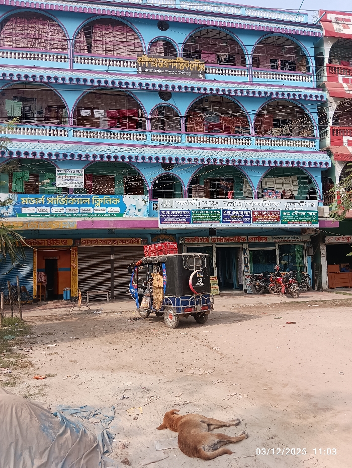 The image depicts an outdoor street scene in Kaliganj, Bangladesh, at approximately 11:03 AM on December 3, 2025. In the foreground, a brown dog is lying on its right side on an unpaved, dusty ground, facing left with its legs extended. To the left of the dog, a light-colored tarp or fabric is crumpled on the ground. The mid-ground features a blue three-wheeled auto-rickshaw, possibly an 'easy bike' type vehicle, parked facing left on the dirt road. It has a black canopy roof with red items, possibly crates, stacked on top, and additional packages secured to its left side. A circular black and white decal is visible on the rear of its canopy. The background is dominated by a multi-story building, likely four floors, with a light blue exterior and purple decorative accents. Each floor features multiple arched openings functioning as windows or balconies, protected by white railings and metal grates. A prominent sign in Bengali on the lower level identifies "মডার্ন প্যাথলজিক্যাল ক্লিনিক" (Modern Pathological Clinic). Additional signs with Bengali text are affixed to the facade, suggesting other businesses or medical practices. At ground level, below the blue building, several storefronts are visible. One on the far left has an open door, revealing a person partially inside. An adjacent storefront has a closed corrugated metal roll-down shutter. Further to the right, another storefront is open, and two motorcycles, one red and one partially obscured, are parked nearby. To the far right, a portion of an adjacent building with a reddish-orange facade and similar arched architectural elements is visible. The scene is static, with no apparent interactions between the visible subjects.