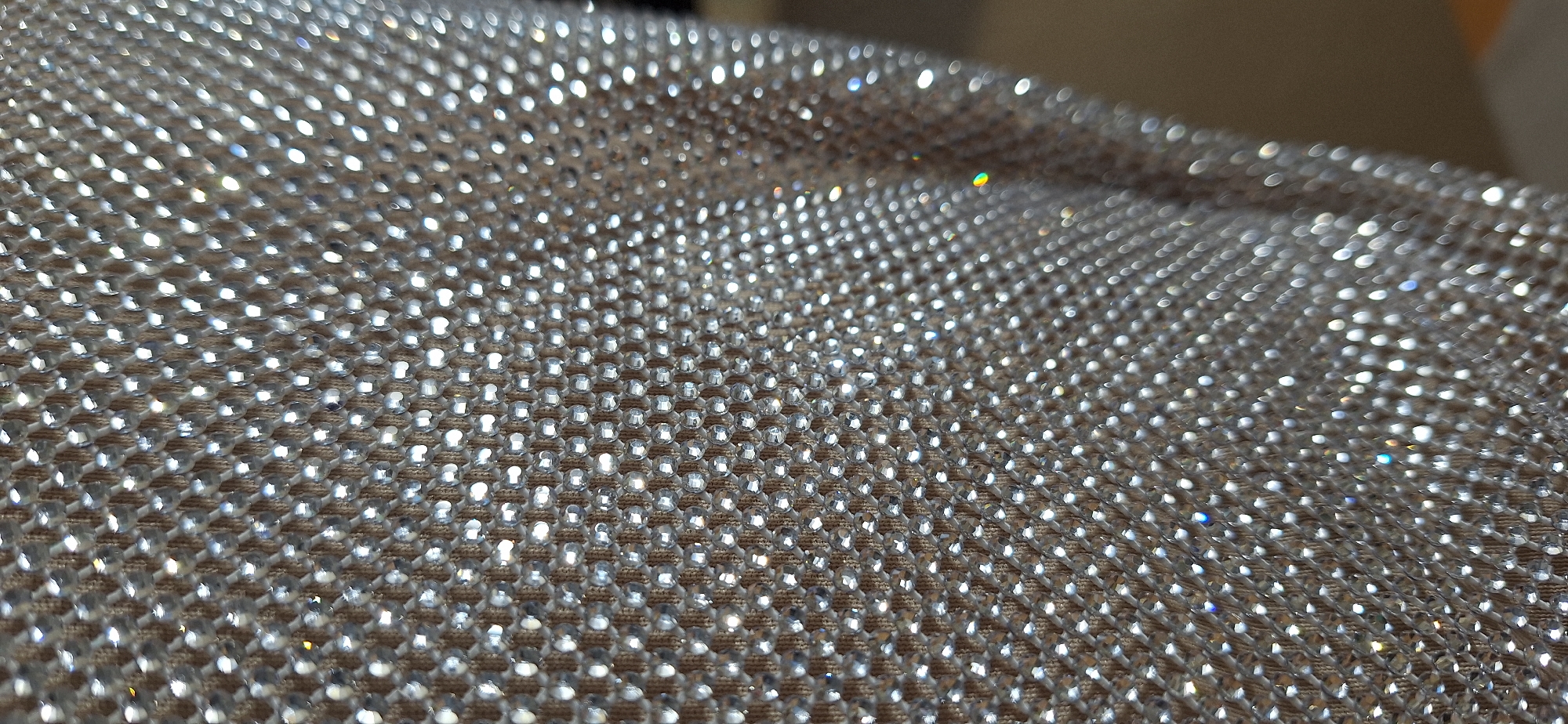 close-up of a fabric covered with small, reflective beads