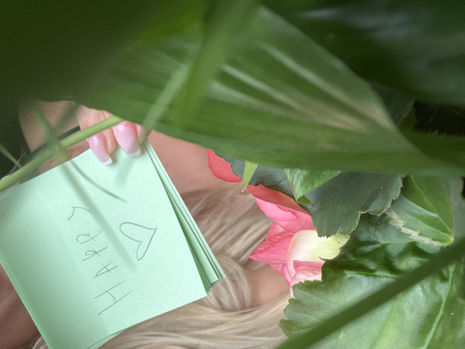 The image captures a close-up view, partially obscured by green foliage, within a natural, plant-rich environment. A person's right hand, displaying manicured fingernails with a French tip design, holds a stack of light green square notes. The top note bears the handwritten word "HAPPY" in capital letters, followed by a hand-drawn heart symbol. Blonde hair is visible on the left side of the frame, partially behind the notes. Below the notes and to the right, a vibrant pink and white flower, possibly a begonia, is prominent, surrounded by various green leaves, some large and broad, others with scalloped edges. A thin vertical plant stem is visible towards the right foreground. The lighting appears bright and natural. The specific location within Crawley, United Kingdom, is not discernable from the visual evidence provided in the image.