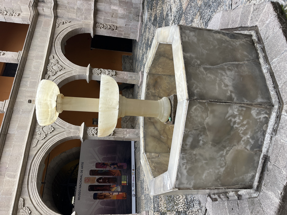The photo shows a courtyard. A two-tiered fountain made of light-colored stone is the focal point, with an octagonal basin and a central pillar. Behind the fountain, architectural details are visible. Arched walkways are visible on the left, with decorative stone carvings. A museum advertisement is displayed at the base of the architecture. The flooring appears to be cobblestone or a similarly textured material.