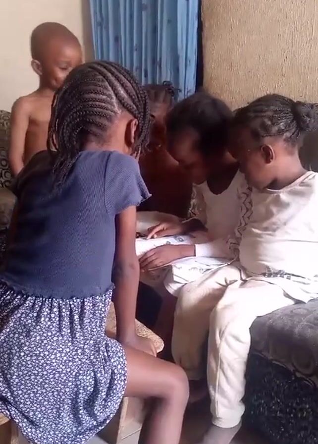 Five children are gathered around a book, apparently studying together. One child, a boy with a shaved head, stands behind them, smiling. Another girl is sitting on a small wooden stool. Two other girls sit on a patterned couch or chair. The fifth child is obscured from view but appears to be a girl who is leaning over the book. The children are all African American. The room has blue curtains and a beige wall. There is a watermark from "TECNO SPARK" in the lower left corner.
