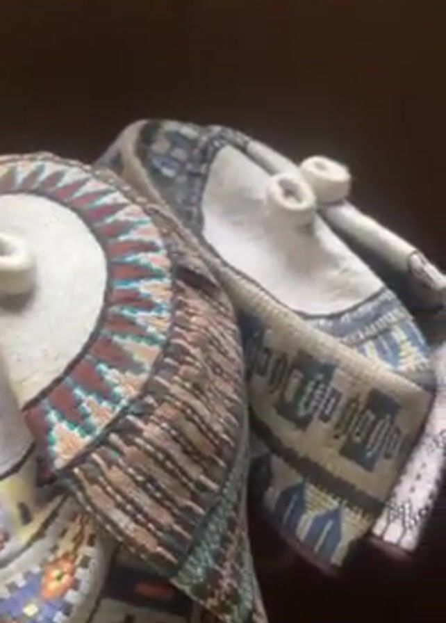A hand holds up a decorative cloth item. The item is folded over and has a repeating pattern with circles. The circles have raised, off-white cylindrical shapes in the center. The edges of the item have a geometric pattern with various colors. The background is dark and out of focus.
