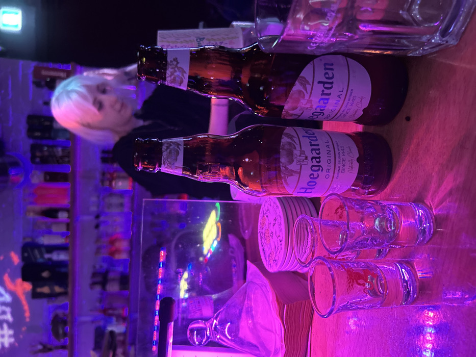The image depicts an indoor scene within a bar or pub located in 마포구, South Korea. The environment is dimly lit with prominent purple and pink neon lighting. In the foreground, a wooden bar counter displays two full or nearly full bottles of Hoegaarden Original beer, three empty clear shot glasses, and one larger empty clear drinking glass. To the left of the beer bottles, a stack of white circular coasters is visible, next to a stack of square paper napkins under a clear glass carafe or pitcher. A reflective surface, possibly a mirror or glass partition, stands behind these items, showing reflections of multicolored neon lights. In the mid-ground and background, behind the bar counter, a person with short, light-colored hair, likely platinum blonde or white, is visible. This individual, presumably a bartender, is wearing dark clothing and is positioned with their head tilted downwards, appearing to be focused on an activity behind the bar. Behind the bartender, multiple shelves stocked with various bottles of alcohol are illuminated by ambient lighting. The overall scene suggests an active evening service at a contemporary establishment.